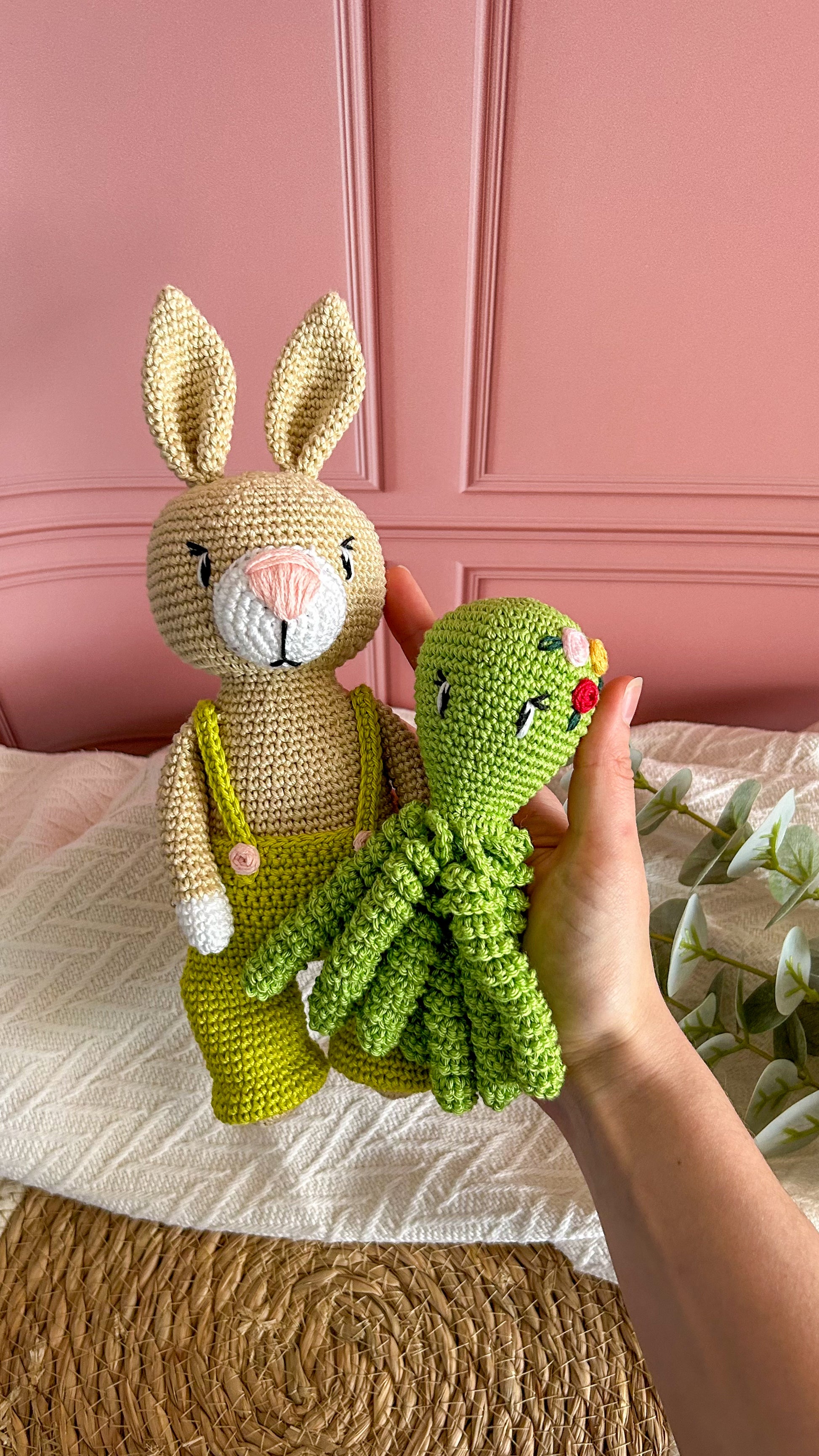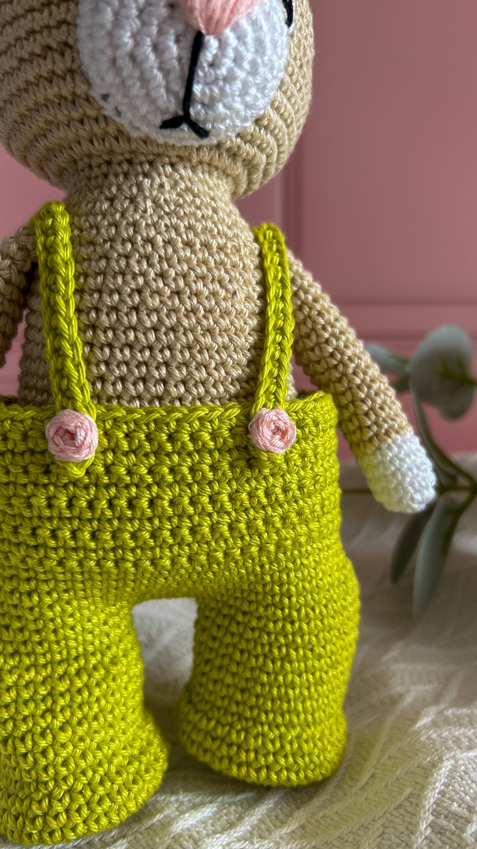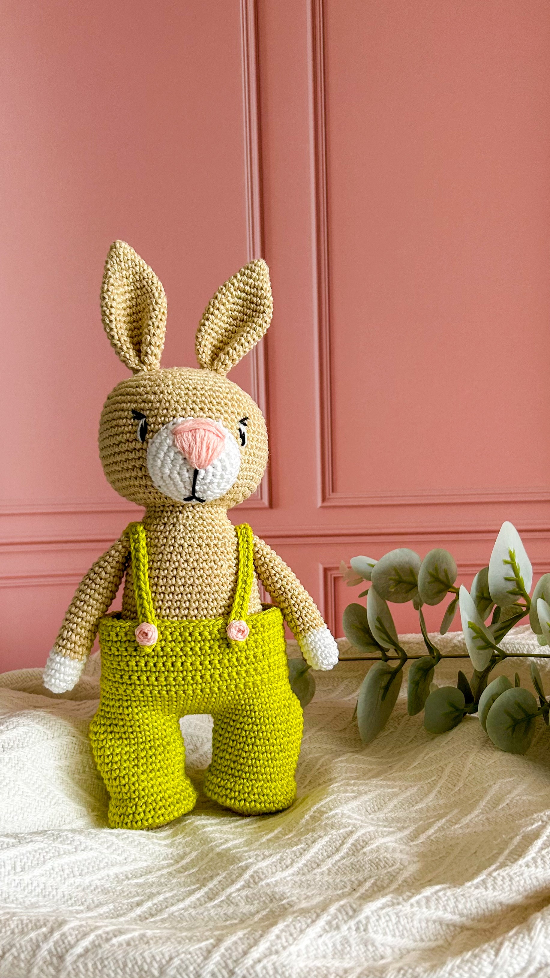 Craquez pour ce charmant lapin au crochet, vêtu de sa jolie salopette !
