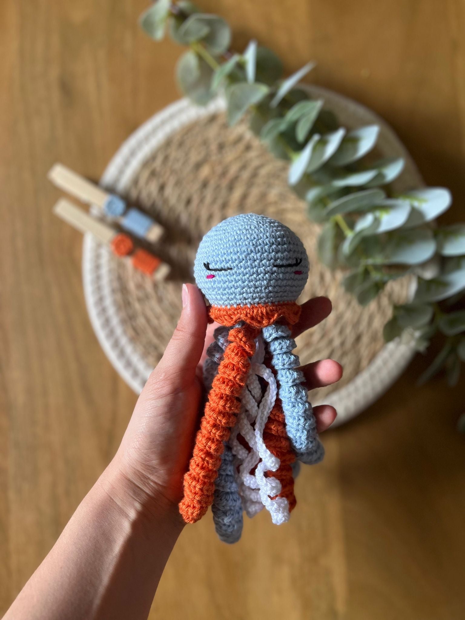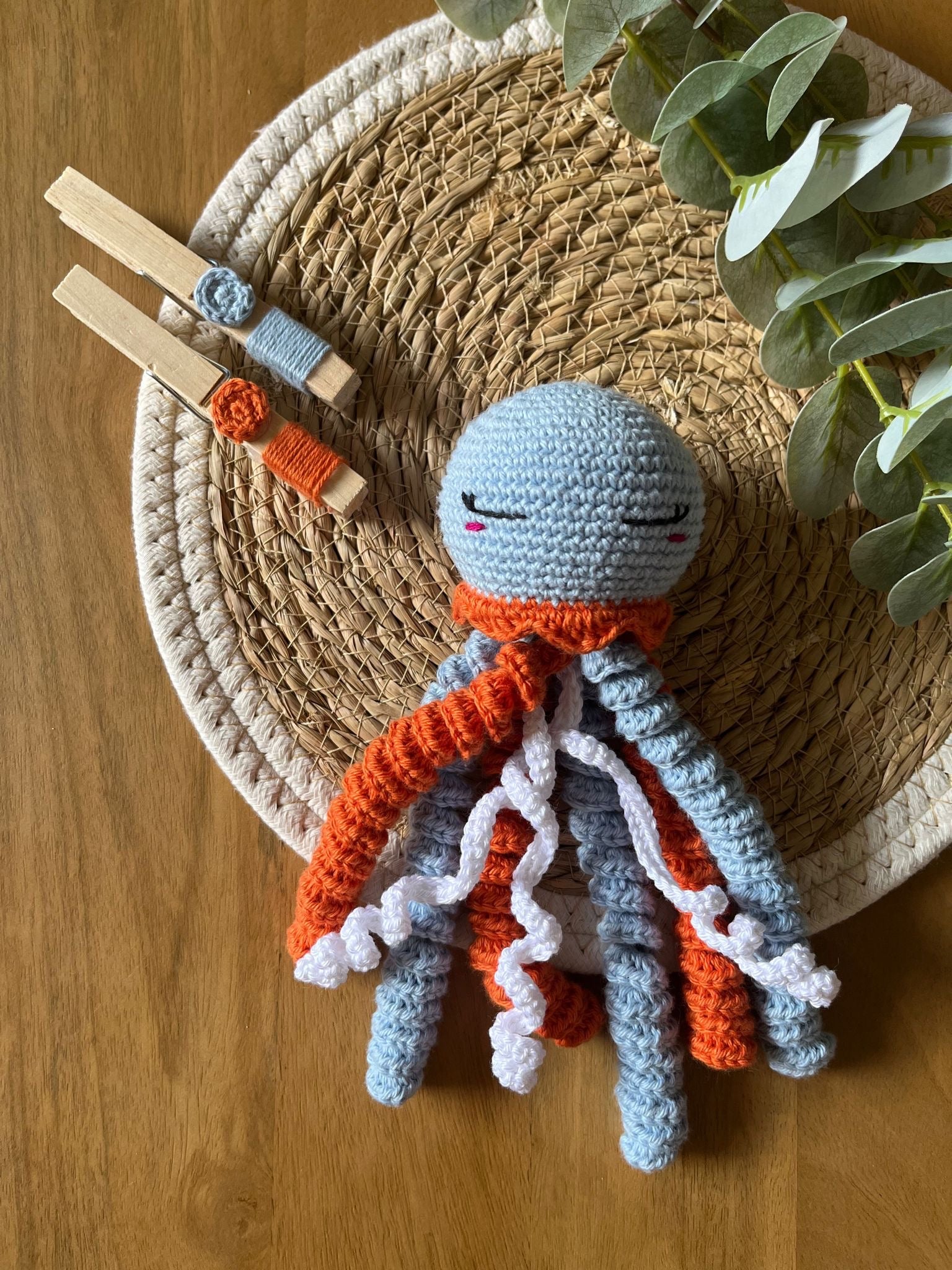 Douce, colorée et pleine de tendresse, cette méduse crochetée à la main est le compagnon idéal des tout-petits. Ses tentacules en spirale stimulent la préhension et l’éveil sensoriel, tandis que ses couleurs vives éveillent l’imaginaire. Un doudou unique, réconfortant et parfaitement adapté aux mains de bébé. 💕