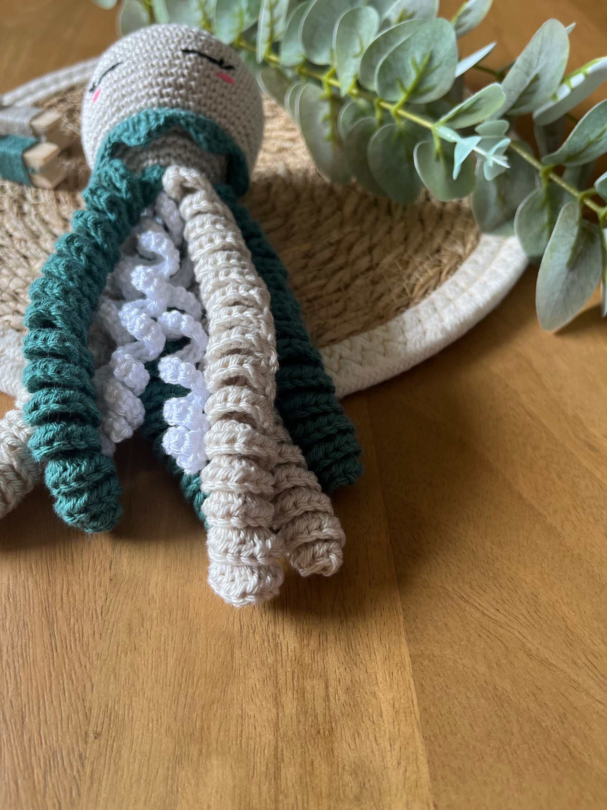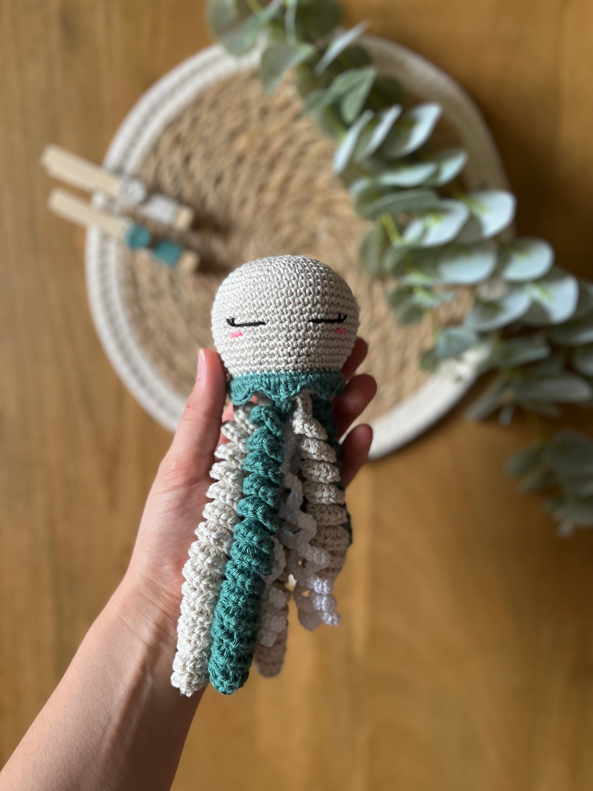 Douce, colorée et pleine de tendresse, cette méduse crochetée à la main est le compagnon idéal des tout-petits. Ses tentacules en spirale stimulent la préhension et l’éveil sensoriel, tandis que ses couleurs vives éveillent l’imaginaire. Un doudou unique, réconfortant et parfaitement adapté aux mains de bébé. 💕