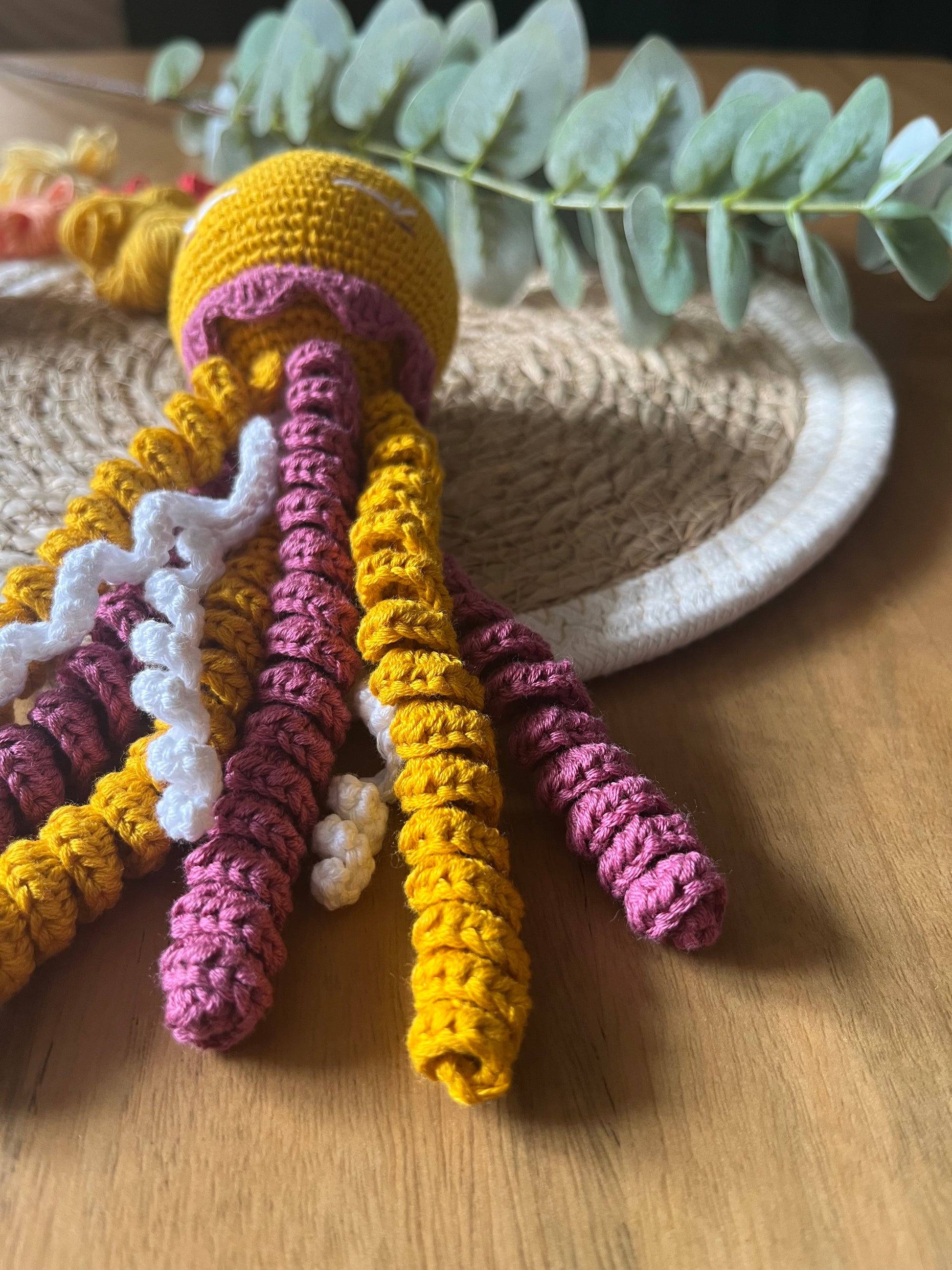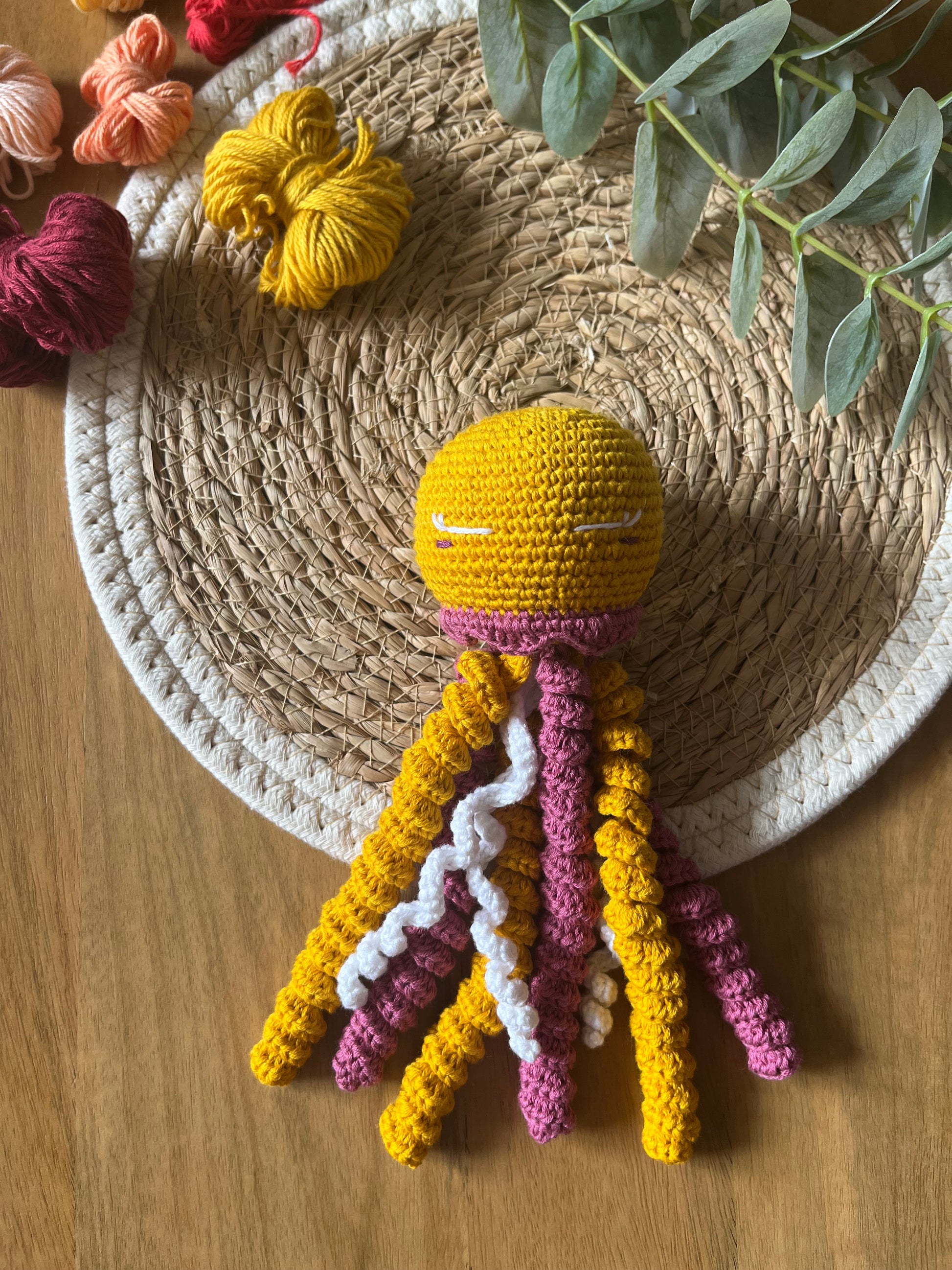 Douce, colorée et pleine de tendresse, cette méduse crochetée à la main est le compagnon idéal des tout-petits. Ses tentacules en spirale stimulent la préhension et l’éveil sensoriel, tandis que ses couleurs vives éveillent l’imaginaire. Un doudou unique, réconfortant et parfaitement adapté aux mains de bébé. 💕