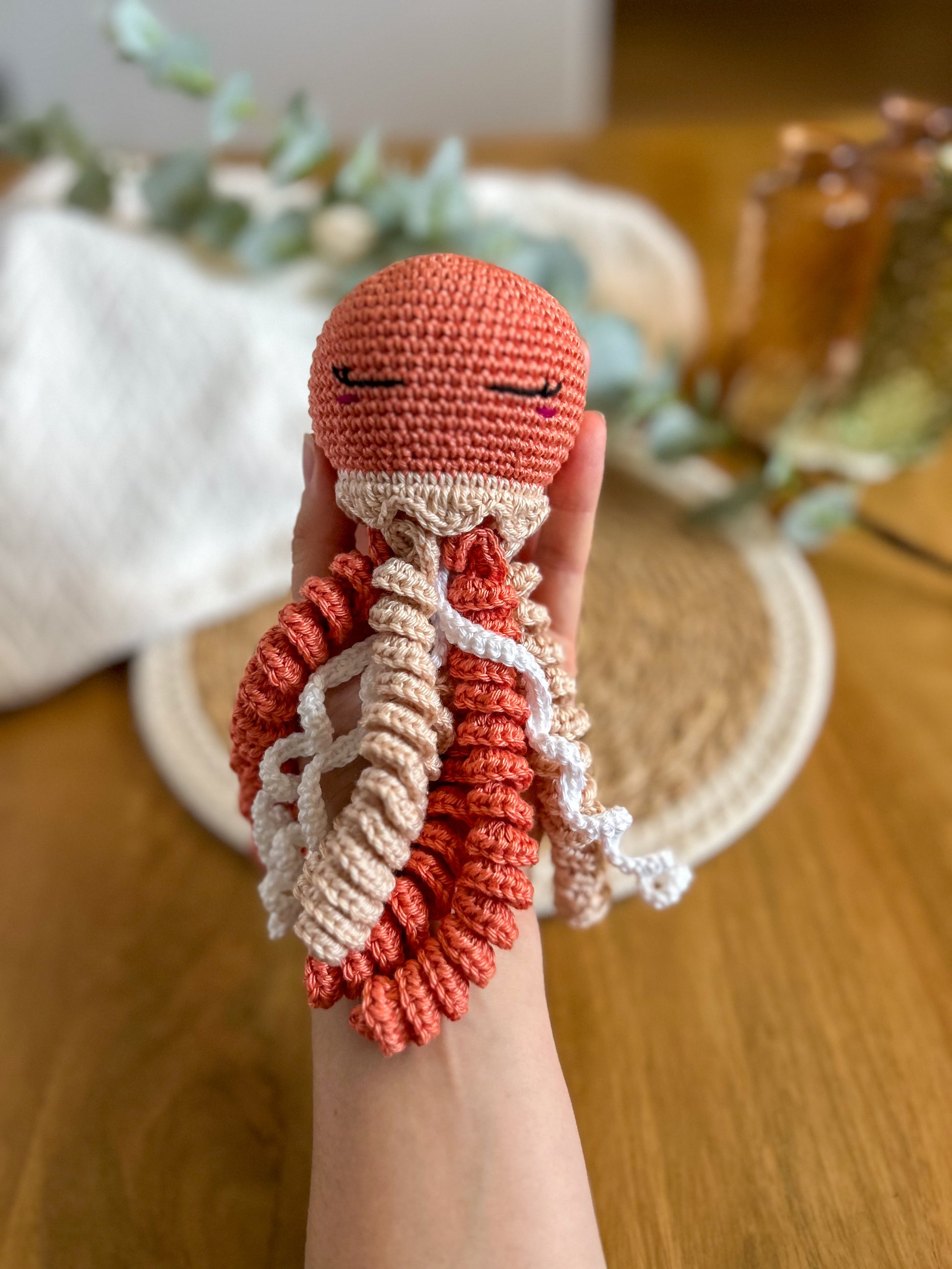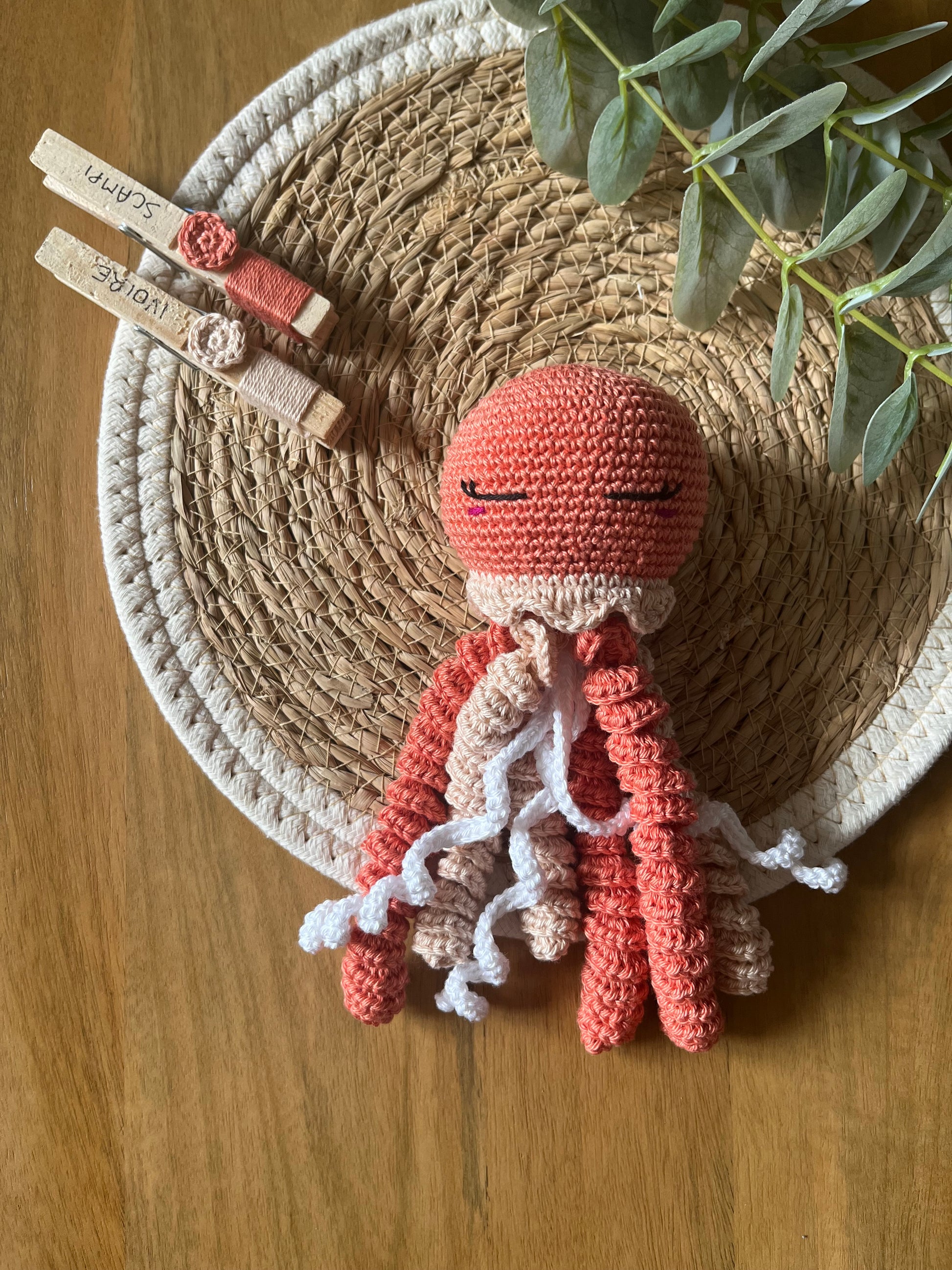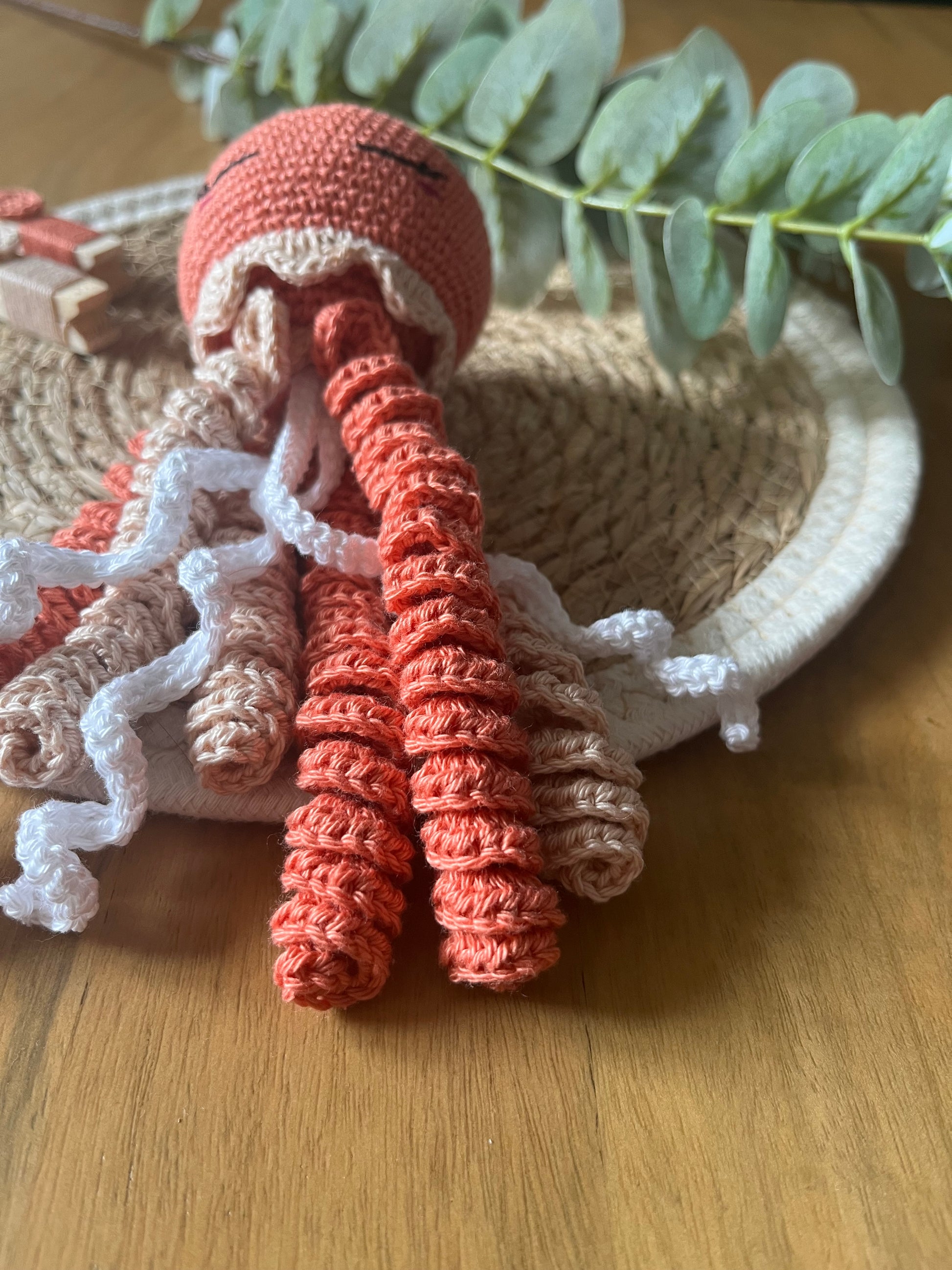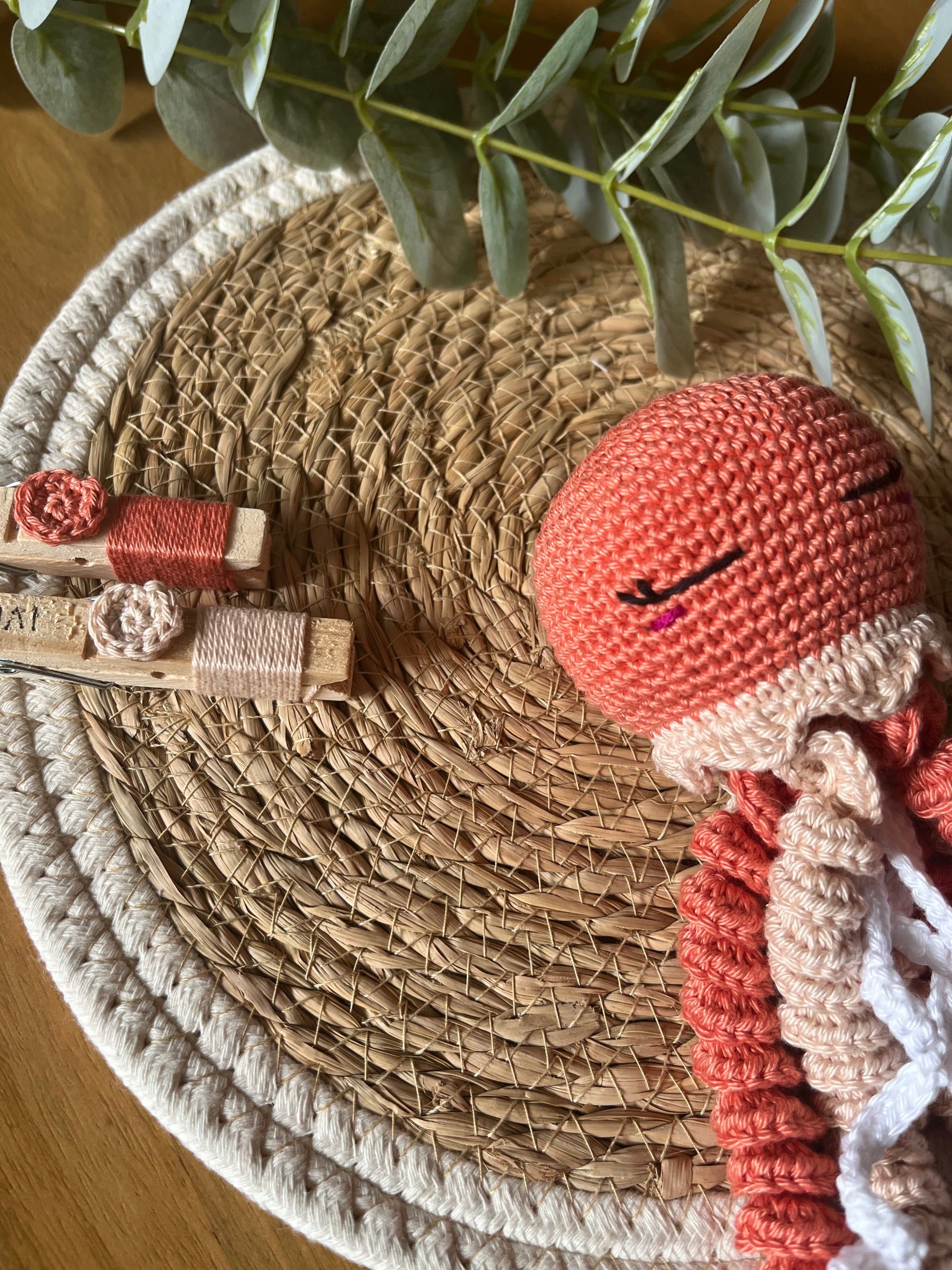 Douce, colorée et pleine de tendresse, cette méduse crochetée à la main est le compagnon idéal des tout-petits. Ses tentacules en spirale stimulent la préhension et l’éveil sensoriel, tandis que ses couleurs vives éveillent l’imaginaire. Un doudou unique, réconfortant et parfaitement adapté aux mains de bébé. 💕