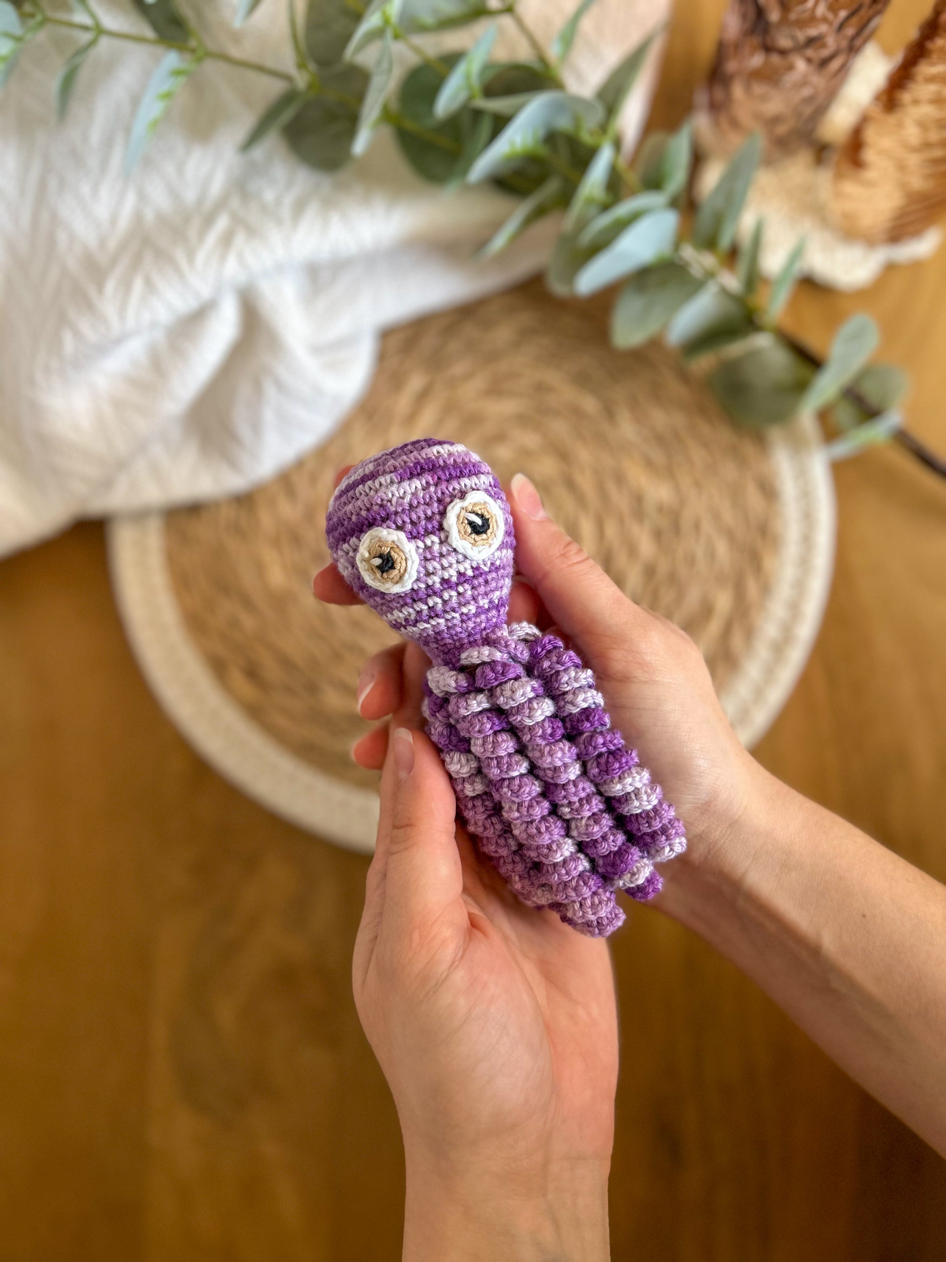 Toute la magie de la pieuvre réside dans ses tentacules torsadés qui rappellent le cordon ombilicale et dans sa taille adaptée aux enfants dès la naissance.
