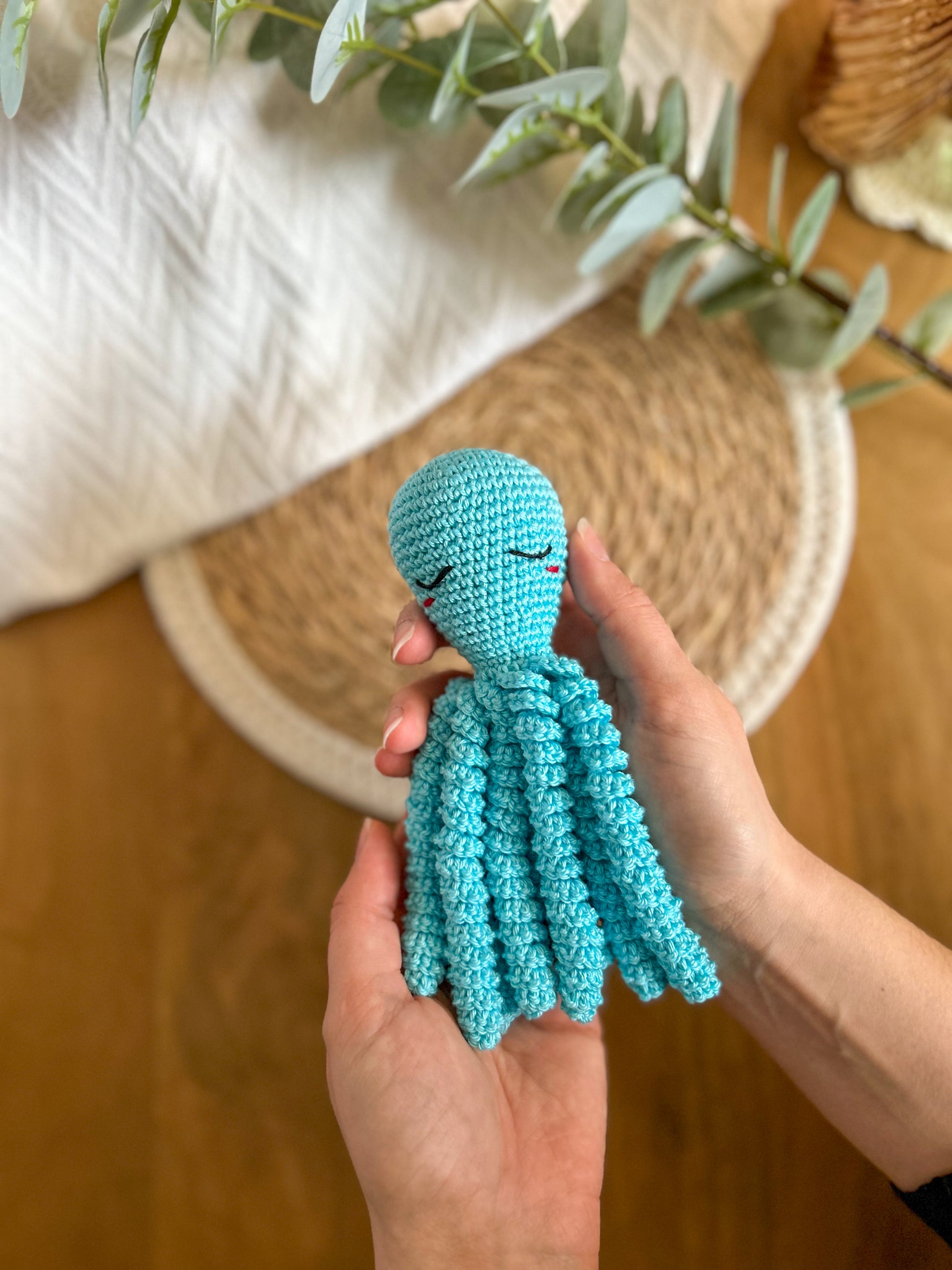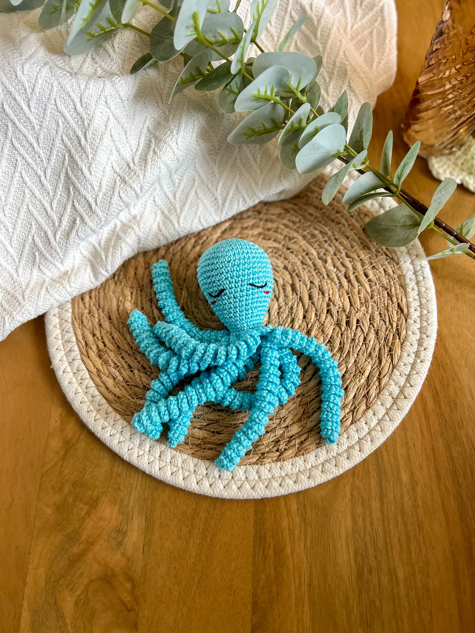 Toute la magie de la pieuvre réside dans ses tentacules torsadés qui rappellent le cordon ombilicale et dans sa taille adaptée aux enfants dès la naissance.