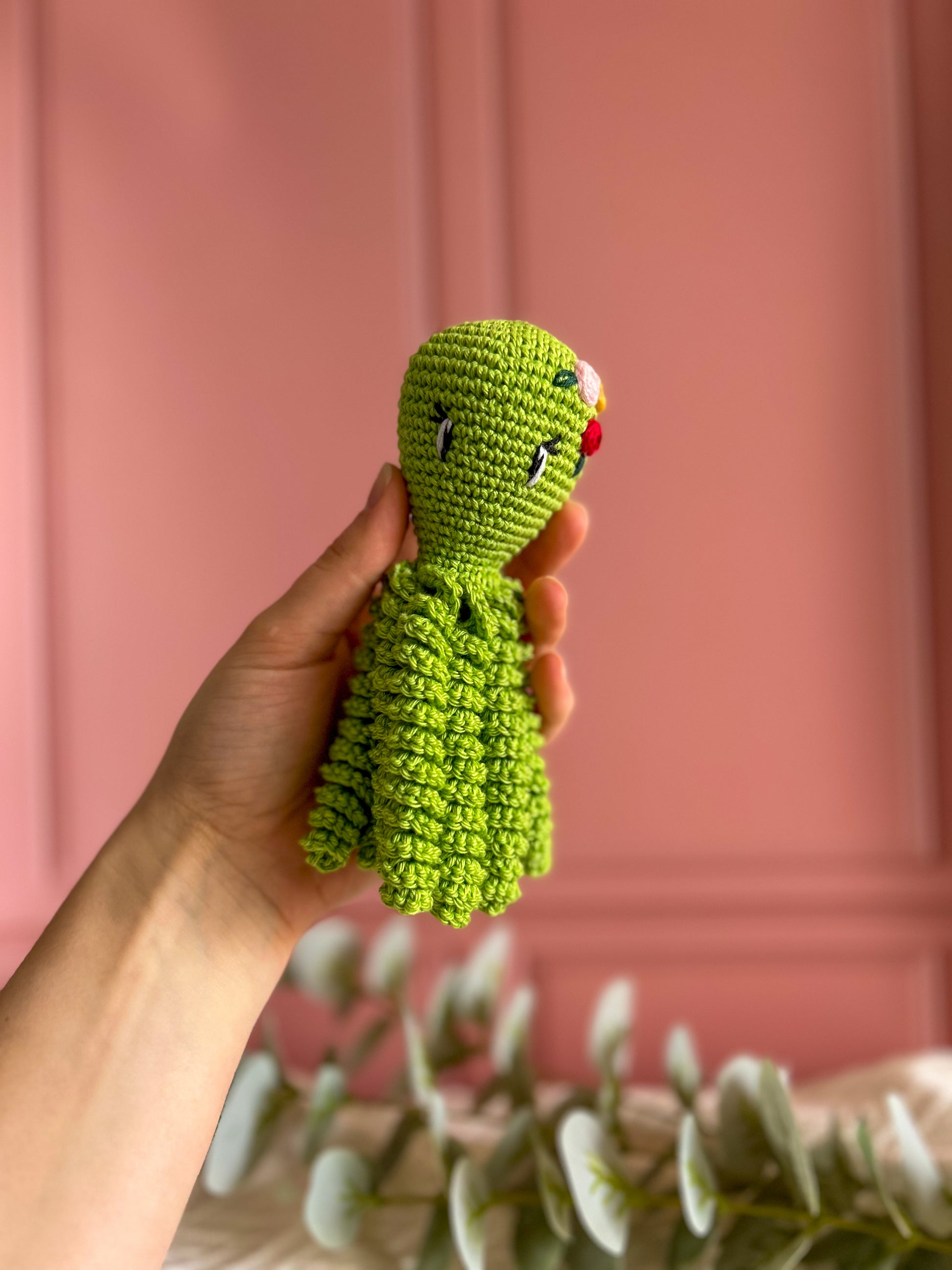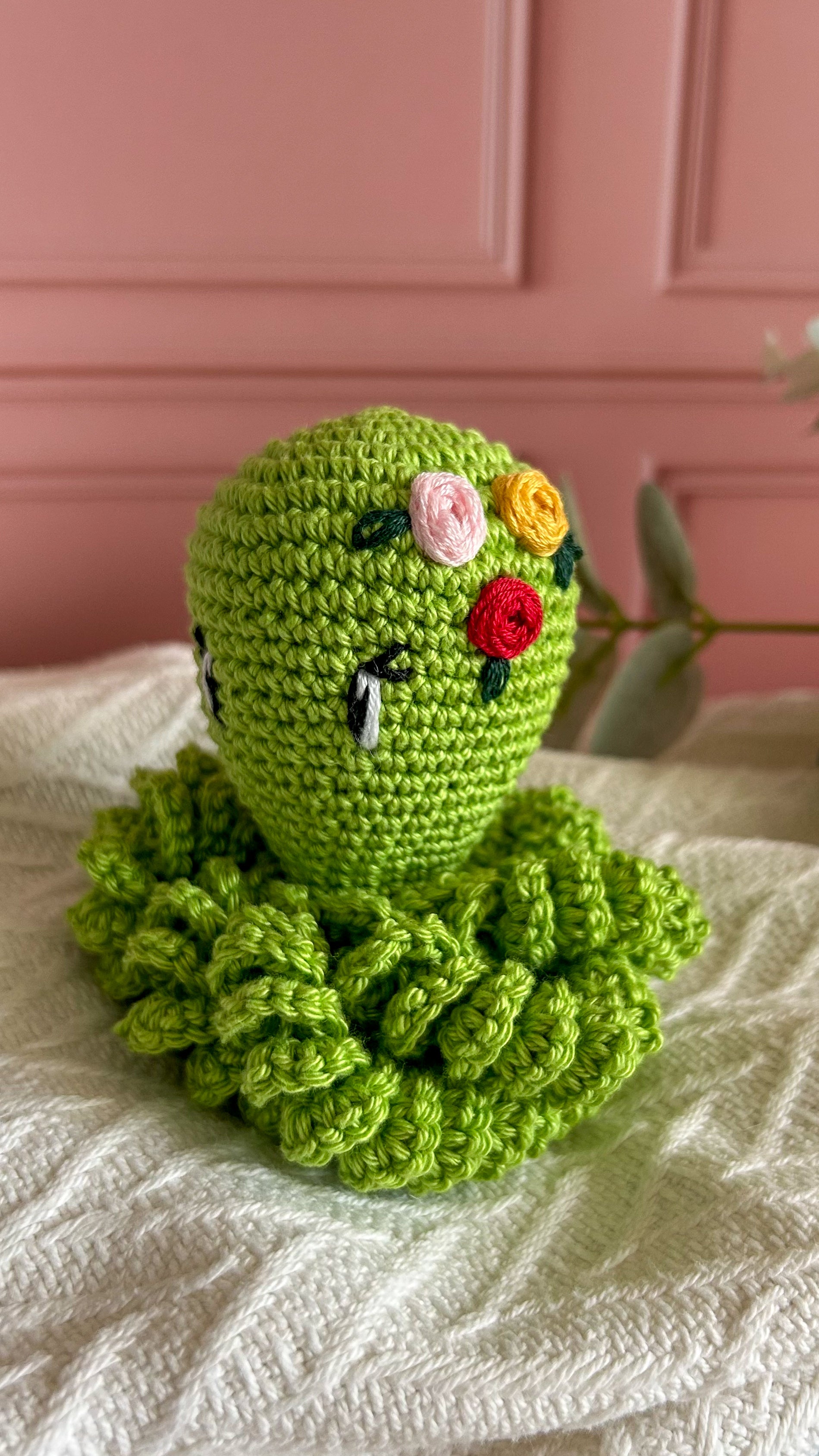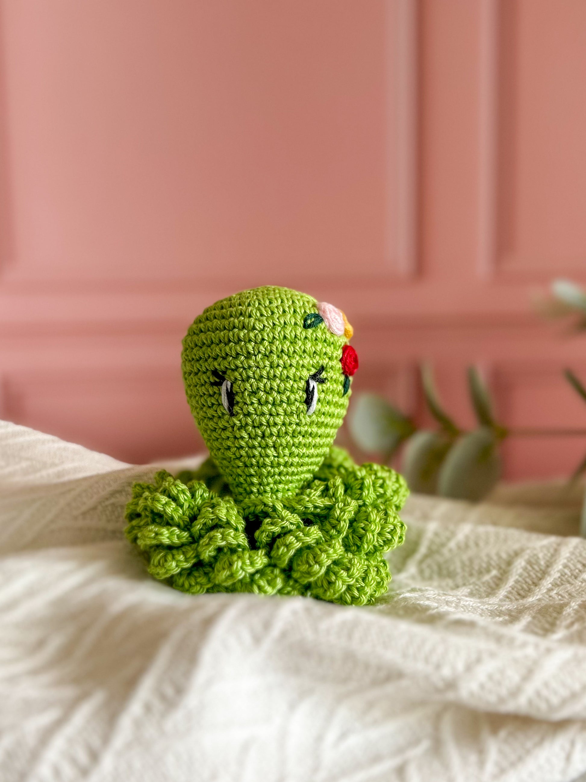 Toute la magie de la pieuvre en crochet réside dans ses tentacules torsadés qui rappellent le cordon ombilicale et dans sa taille adaptée aux enfants dès la naissances.
