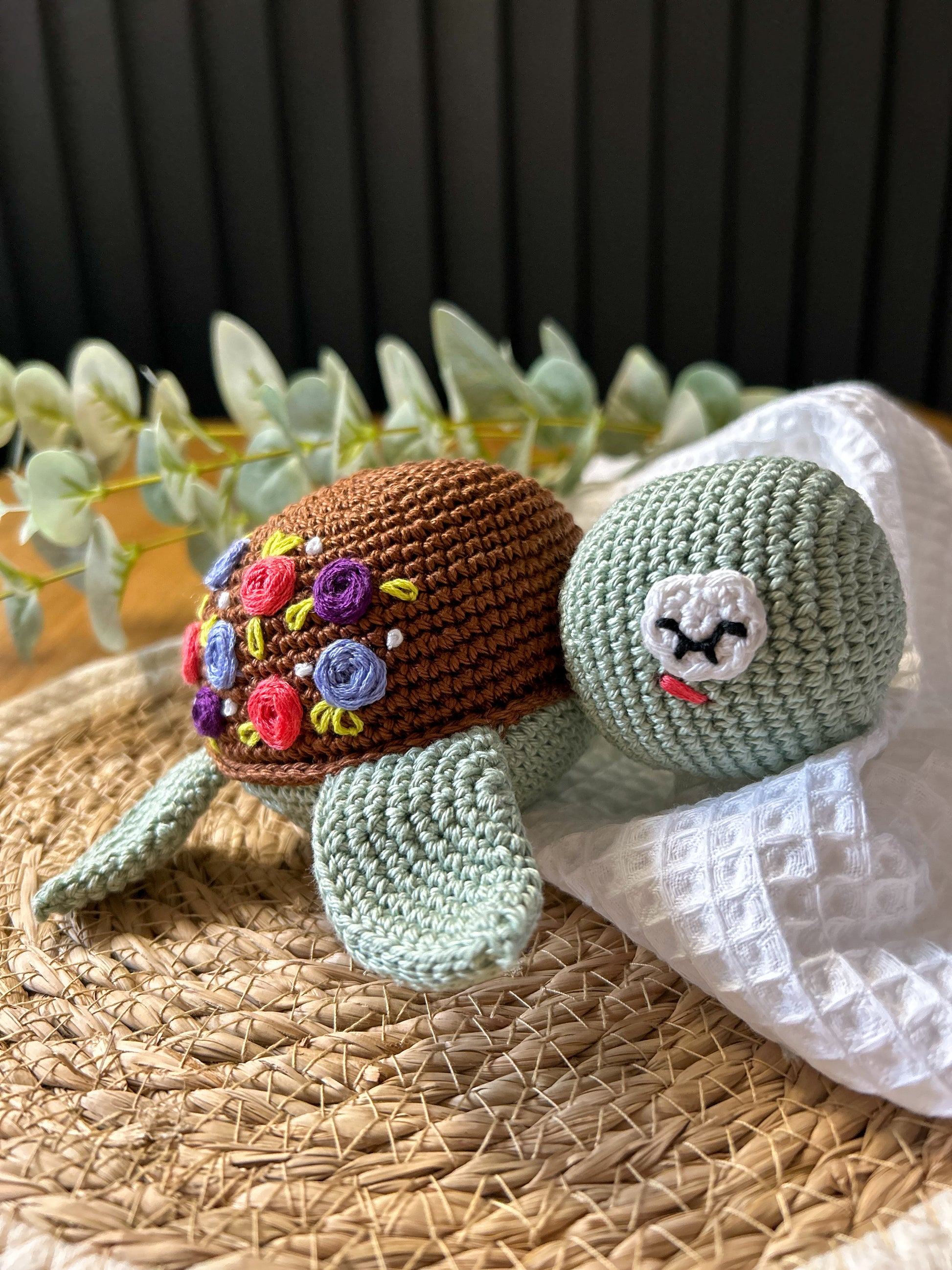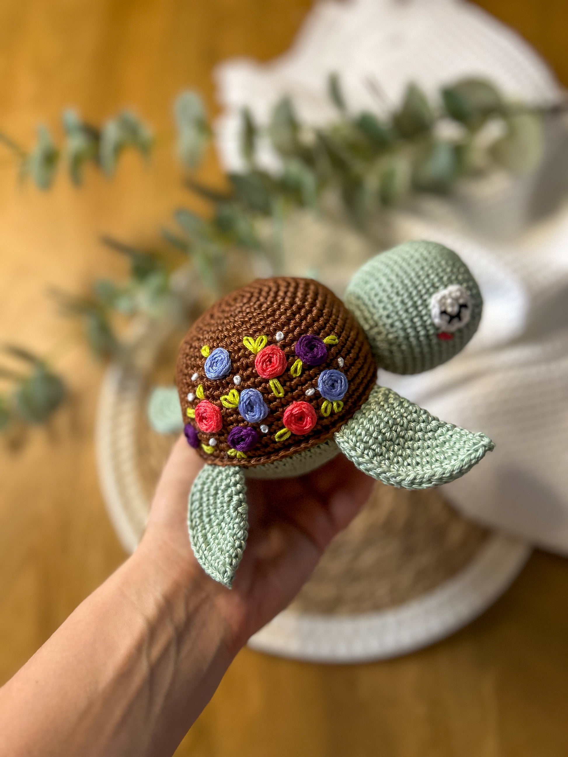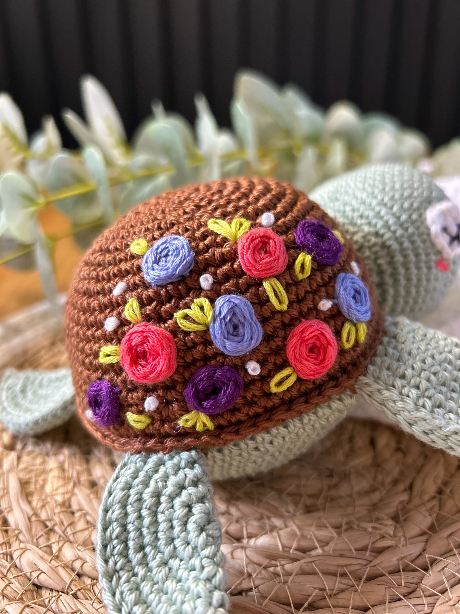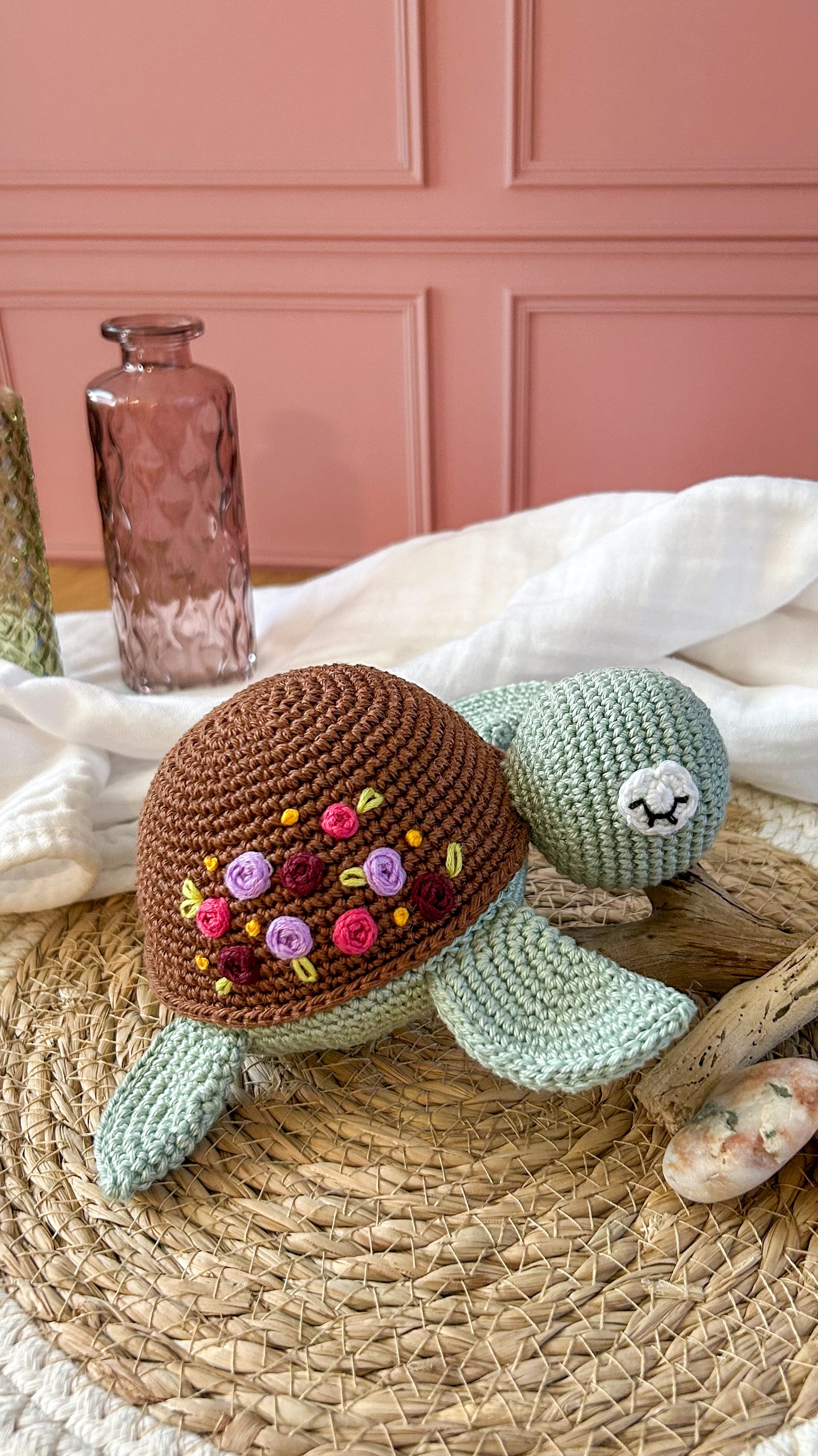 Confectionnée avec amour au crochet, sa carapace fleurie au grés de mon inspiration apporte une touche poétique et unique.